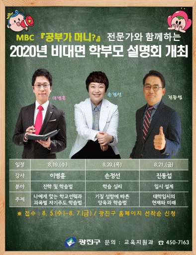½ÅûÀº ¿À´Â 5~7ÀϱîÁö ±¤Áø±¸ ȨÆäÀÌÁö¿¡¼ °¡´ÉÇϸç, ÀÚ¼¼ÇÑ ¹®ÀÇ »çÇ×Àº ±¤Áø±¸ ±³À°Áö¿ø°ú(¢Ï450-7163)À¸·Î ÇÏ¸é µÈ´Ù.