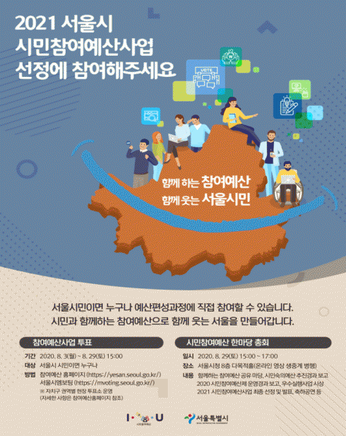 ¼¿ï½Ã´Â '21³â ½Ã¹ÎÂü¿©¿¹»ê »ç¾÷ ¼±Á¤ ÅõÇ¥¸¦ 3ÀÏ(¿ù) ½ÃÀÛÇÑ´Ù°í ¹àÇû´Ù. ÅõÇ¥´Â ½Ã¹ÎÂü¿©¿¹»ê ȨÆäÀÌÁö(http://yesan.seoul.go.kr)¿Í ¼¿ï½Ã ¡®¿¥º¸ÆÃ¡¯ ¾ÛÀ» ÅëÇØ ÇÒ ¼ö ÀÖ´Ù. »ç¾÷ Á¦¾ÈÀÚ »Ó ¾Æ´Ï¶ó ÀÏ¹Ý ¼¿ï½Ã¹Î ´©±¸³ª Âü¿©ÇÒ ¼ö ÀÖ´Ù. 25°³ ±¸Ã»°ú ÁöÇÏö ½Ãû ¿ª»ç ³» ÇöÀåÅõÇ¥¼Òµµ ¿î¿µÇÑ´Ù.