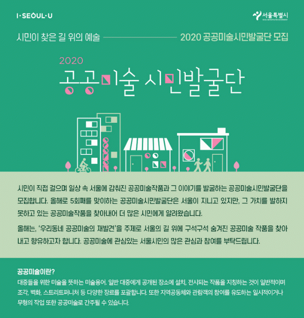 <2020 °ø°ø¹Ì¼ú ½Ã¹Î¹ß±¼´Ü>Àº ¡®¿ì¸®µ¿³× °ø°ø¹Ì¼ú¡¯À» ÁÖÁ¦·Î ¼¿ïÀ» µ¿ºÏ¡¤µ¿³²¡¤¼ºÏ¡¤¼³² 4°³ ±Ç¿ªÀ¸·Î ³ª´©¾î ÁøÇàÇϸç, Áö³ÇØ ½Ã¹üÀûÀ¸·Î ½ÃÇàÇÑ ¡®µµ½¼Æ® ÇÁ·Î±×·¥¡¯À» Àü¸é È®´ëÇÏ¿© ´õ ¸¹Àº ½Ã¹Î¿¡°Ô ÀÛǰÀ» Á÷Á¢ ¼Ò°³ÇÑ´Ù.