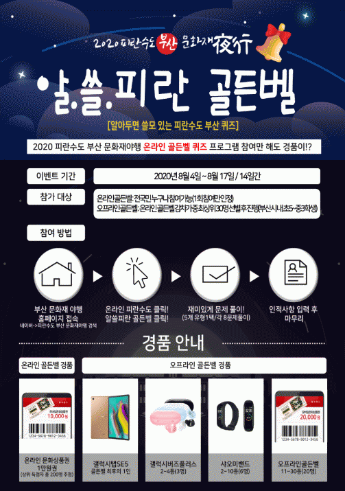 ºÎ»ê¹®ÈÀç ¾ßÇà ȨÆäÀÌÁö(http://busan-heritage-night.com)¸¦ ÅëÇØ Àü±¹¹Î ´©±¸³ª Âü°¡ °¡´ÉÇÏ¸ç ¾Ë?¾µ?ÇǶõ °ñµçº§ ´ëȸ¿¡ Âü°¡ÇÑ °íµæÁ¡ÀÚ Áß Ãß÷À» ÅëÇØ 200¸í¿¡°Ô °æÇ°(¿Â¶óÀÎ ¹®È»óǰ±Ç 1¸¸ ¿ø)µµ Áö±ÞÇÑ´Ù.