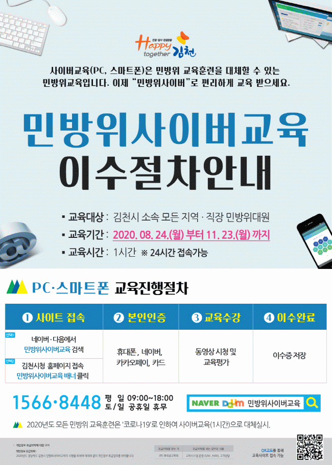 ±³À°¹æ¹ýÀº ±èõ½Ãû ȨÆäÀÌÁö ¹è³Ê³ª Æ÷ÅÐ »çÀÌÆ®¿¡¼ ¹Î¹æÀ§ »çÀ̹ö ±³À°¼¾Å͸¦ Á¢¼ÓÇÏ¿© º»ÀÎ ÀÎÁõ ÈÄ¿¡ ±³À°À» ¼ö°ÇÒ ¼ö ÀÖÀ¸¸ç, ±³À°°ú¸ñÀÇ ±¸¼ºÀº ¹Î¹æÀ§ Á¦µµ, ¹Î¹æÀ§´ë ÀÓ¹«¡¤¿ªÇÒ, ÀÎ¸í±¸Á¶, ÀÀ±Þóġ µîÀ¸·Î ÃÑ 20¹®Ç× Áß 14¹®Á¦ ÀÌ»ó(70Á¡ ÀÌ»ó ȹµæ ½Ã)À» ¸ÂÃß¾î¾ß ±³À°À» À̼öÇÑ °ÍÀ¸·Î ÀÎÁ¤ÀÌ µÈ´Ù.