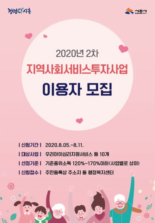 2020³â 2Â÷ Áö¿ª»çȸ¼ºñ½ºÅõÀÚ»ç¾÷ ÀÌ¿ëÀÚ ¸ðÁýÀº Áֹεî·Ï»ó °ÅÁÖÁö µ¿ ÇàÁ¤º¹Áö¼¾Å͸¦ ÅëÇØ Á¢¼öÇϸç, Âü¿©¸¦ ¿øÇÏ´Â ÁÖ¹ÎÀº ½ÅºÐÁõ°ú °Ç°º¸ÇèÁõ»çº», »ç¾÷º° Çʿ伷ù µîÀ» ÁغñÇØ ¹æ¹®Á¢¼öÇÏ¸é µÈ´Ù.
