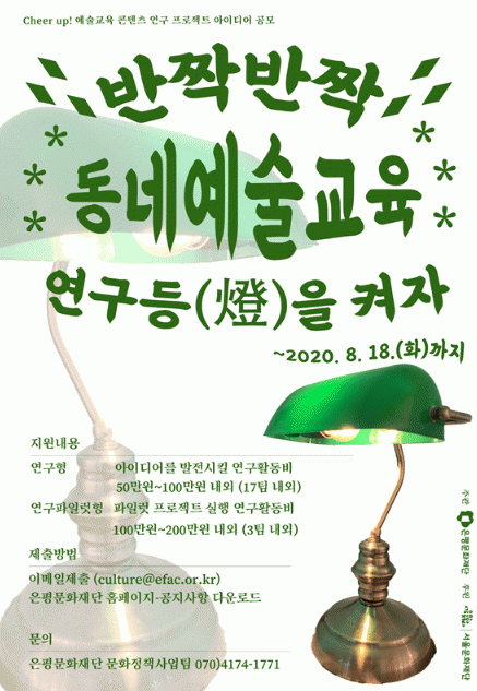 ¡°Follow up! ÀºÆò ¿¹¼ú±³À°¡±¡ºCheer up! ¿¹¼ú±³À° ÄÜÅÙÃ÷¿¬±¸ ÇÁ·ÎÁ§Æ®¡»·Î ÁøÇàµÇ´Â ¾ÆÀ̵ð¾î °ø¸ðÁö¿øÀº Áö¿ª ³» ¿¹¼ú±³À° ÀÚ¿øÀ» ¹ß±¼ÇÏ°í »õ·Î¿î ÄÜÅÙÃ÷¸¦ ½ÇÇèÇØº¼ ¼ö ÀÖ´Â ±âȸ¸¦ Á¦°øÇϱâ À§ÇØ ±âȹµÆ´Ù. ÀÛ³â(2019³â)¿¡´Â ÃÑ 4ÆÀÀ» ¼±Á¤ÇØ Áö¿ª ¼³È¸¦ Ȱ¿ëÇÑ ÄÜÅÙÃ÷ ¿¬±¸, ¹ß´ÞÀå¾Ö¾Æµ¿À» À§ÇÑ ¿¹¼ú±³À° Ä¿¸®Å§·³ ¿¬±¸, »çÁøÀ» ¸Å°³·Î ÁÖ¹ÎÂü¿©Çü ¿¹¼ú±³À° ÄÜÅÙÃ÷ ¿¬±¸, Áö¿ª ¿¹¼úÀΰú ±³·ù Ȱ¼ºÈ¸¦ À§ÇÑ ÄÜÅÙÃ÷ ¿¬±¸ µî ´Ù¾çÇÑ ¿¹¼ú±³À° ÄÜÅÙÃ÷¸¦ Áö¿øÇß´Ù.