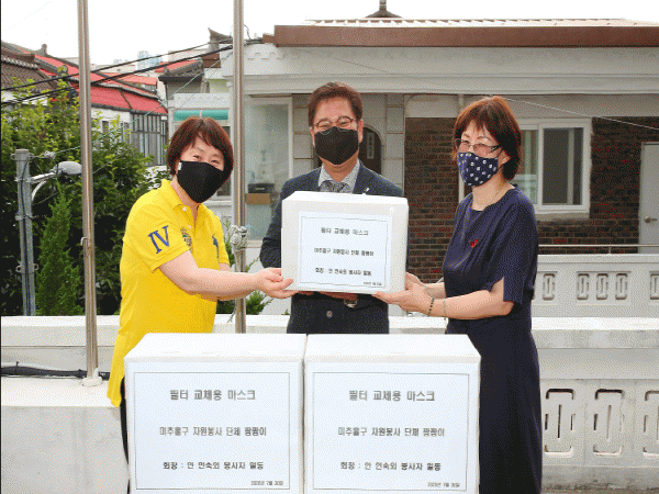 ÀÎõ ¹ÌÃßȦ±¸(±¸Ã»Àå ±èÁ¤½Ä) ÀÚ¿øºÀ»ç´ÜüÀΠ««À̴ ȸ¿øµé°ú ÁÖ¹ÎÀÌ ÇÔ²² ¸¸µç À롧 ¸¶½ºÅ© 400ÀåÀ» ¿¬¼öµ¿ ÇÔ¹Ú¸¶À»¿¡ Àü´ÞÇß´Ù.