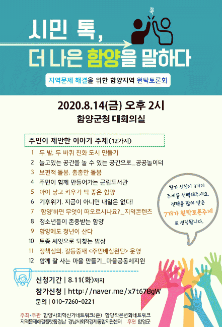 À̹ø Åä·Ðȸ´Â Áö¿ª¹®Á¦ÇذáÇ÷§Æû °æ³² »ç¹«±¹(»ç¹«±¹Àå ½ÉÀΰæ)°ú ÇÔ¾çÇõ½Å°¡³×Æ®¿öÅ© Áغñ¸ðÀÓ(´ëÇ¥ ±èÂùµÎ) ÁÖ°üÀ¸·Î Áö³ 7¿ù ÇÑ ´Þ°£ ³ªÀÌ¿Í °èÃþ¿¡ »ó°ü¾øÀÌ Áö¿ª ¹®Á¦¸¦ °øÀ¯Çϰí ÇØ°á ¹æ¾ÈÀ» ¸ð»öÇϱâ À§ÇØ ÁøÇàÇß´ø 14°³ÀÇ À̾߱⠸ðÀÓ¿¡¼ Á¦¾ÈµÈ 12°³ ÀÇÁ¦¿¡ ´ëÇØ¼ Âü¿©¸¦ Èñ¸ÁÇÏ´Â Áֹεé°ú ÇÔ²² ÁÖÁ¦ ºÐÀÓº°·Î ÆÛ½Ç¸®µ¥ÀÌÅÍ ÁÖ°ü ÇÏ¿¡ Åä·ÐÀ» ÁøÇàÇÒ ¿¹Á¤ÀÌ´Ù.