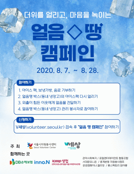 À̹ø ¾óÀ½ ¶¯ ÇÁ·ÎÁ§Æ®´Â ¿î¿µ±â°£ÀÌ Áö³ ÀÌÈÄ¿¡µµ °¢ Áö¿ª°ú ´ÜüµéÀÌ ¿¬°áµÇ¾î ´Ê´õÀ§±îÁö ¿î¿µµÉ ¼ö ÀÖµµ·Ï ÁøÇà µÇ¸ç, ÀÌÈÄ¿¡µµ ÀÌ¿ôÀ» ÇÔ²² »ìÇÇ´Â ¡°»çȸÀû °í¸³ ÇØ°á-ÀÌÁ¦´Â ¿Ü·ÓÁö ¾Ê¾Æ¿ä! Ä·ÆäÀΡ±µµ ÁøÇàÇÒ ¿¹Á¤ÀÌ´Ù. °ü·Ã Á¤º¸´Â ÀÚ¿øºÀ»ç ¿Â¶óÀÎ V¼¼»ó(volunteer.seoul.kr)¿¡¼ È®Àΰ¡´ÉÇϸç, ±âŸ ¹®ÀÇ´Â ´ã´çÀÚ(02-2136-8735)·Î ÇÏ¸é µÈ´Ù.