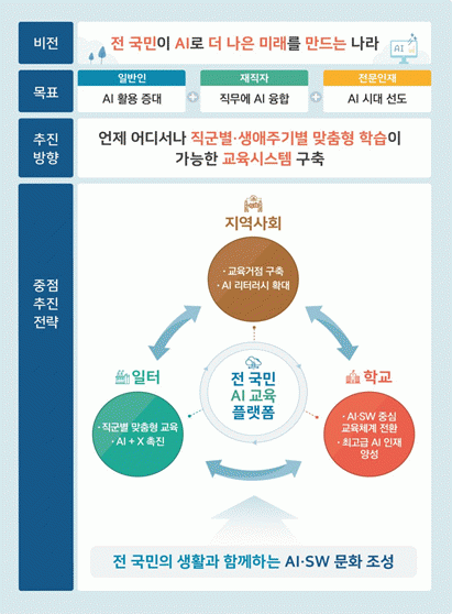 À̹ø¿¡ ¹ßÇ¥µÈ ¡®Àü±¹¹Î ÀΰøÁö´É(AI)¡¤¼ÒÇÁÆ®¿þ¾î(SW) ±³À° È®»ê¹æ¾È¡¯Àº Àü ±¹¹ÎÀÇ µðÁöÅÐ ¼ö¿ë¼ºÀ» ³ô¿© µðÁöÅÐ ´ºµôÀÇ ¼º°ú¸¦ ±Ø´ëÈÇÔ°ú µ¿½Ã¿¡ ¼¼´ë¡¤°ÅÁÖÁö¡¤Á÷±º µî°ú °ü°è¾øÀÌ ÀΰøÁö´ÉÀÇ ÇýÅÿ¡¼ ¼Ò¿ÜµÇÁö ¾Ê´Â ±³À°È¯°æÀ» ±¸ÃàÇÏ¿© ¡®Àü ±¹¹ÎÀÌ ÀΰøÁö´ÉÀ¸·Î ´õ ³ªÀº ¹Ì·¡¸¦ ¸¸µå´Â ³ª¶ó¡¯¸¦ ±¸ÇöÇÏ´Â °ÍÀ» ¸ñÇ¥·Î ÇÑ´Ù.
