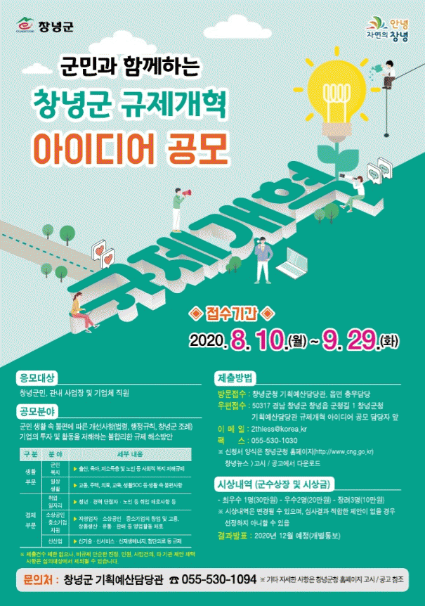 Âü¿©´ë»óÀº ±ÔÁ¦°³¼±¿¡ °ü½É ÀÖ´Â ±º¹Î, °ü³» »ç¾÷Àå ¹× ±â¾÷ü Á÷¿øÀ¸·Î â³ç±º ȨÆäÀÌÁö¿¡ °Ô½ÃµÈ ¡®2020³â ±ÔÁ¦°³Çõ ¾ÆÀ̵ð¾î °ø¸ð¡¯¿¡¼ ½Åû¼¸¦ ³»·Á¹Þ¾Æ ÀÛ¼ºÇÑ ÈÄ °ø¸ð±â°£ ³»¿¡ ¹æ¹®, ¿ìÆí, ÆÑ½º, À̸ÞÀÏÀ» ÅëÇØ Á¦ÃâÇÏ¸é µÈ´Ù.