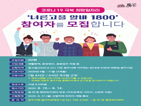 ¸ðÁý ±â°£Àº 10ÀϺÎÅÍ 14ÀϱîÁöÀÌ¸ç ¸¸ 18¼¼ ÀÌ»óÀÇ ±¤ÁֽùÎÀÌ¸é ´©±¸³ª ½ÅûÀÌ °¡´ÉÇÏ´Ù. Ãë¾÷Ãë¾à°èÃþ°ú Äڷγª19·Î ÀÎÇÑ ½ÇÁ÷ÀÚ, Æó¾÷ÀÚ µîÀº ¿ì¼± ¼±¹ß ´ë»óÀÌ´Ù.