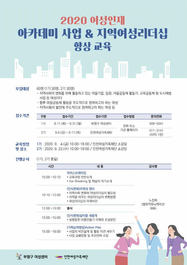 ±³À°»ý ¸ðÁýÀº 1±â 8¿ù 11ÀϺÎÅÍ 8¿ù 31ÀϱîÁö(ºÎÆò±¸ ¿©¼º¼¾ÅÍ Á¢¼ö), 2±â 9¿ù 4ÀϺÎÅÍ 9¿ù 17ÀϱîÁö(ÀÎõ¿©¼º°¡Á·Àç´Ü Á¢¼ö) ¼±Âø¼øÀ̸ç, °¢ ±â°üÀÇ È¨ÆäÀÌÁö³ª ÀüÈ·Î ½ÅûÇÒ ¼ö ÀÖ´Ù.