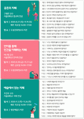 µµºÀ¹®ÈÁ¤º¸µµ¼°ü¿¡¼´Â ¡ã8¿ù 27ÀϺÎÅÍ 11¿ù 19ÀϱîÁö Àηù°¡ Áö´Ñ °øÁ¸ÀÇ ´É·ÂÀ» ÀÌÇØÇÏ°í ´Ù¾çÇÑ »ç¶÷µé°ú °Þ´Â ¹®Á¦¸¦ ÇØ°áÇϱâ À§ÇØ °í¹ÎÇÏ´Â ¡®°øÁ¸ÀÇ ÁöÇý¡¯(±¸ÇüÂù ±³¼ö, ¼¿ï´ëÇб³)¿Í ¡ã8¿ù 28ÀϺÎÅÍ 11¿ù27ÀϱîÁö ³»°¡ ¾²´Â ¾ð¾î¸¦ ÀÌÇØÇÔÀ¸·Î½á ŸÀÎÀ» ÀÌÇØÇÏ´Â ¹ýÀ» ¹è¿ì´Â ¡®¾ð¾î¸¦ ÅëÇØ Àΰ£À» ÀÌÇØÇÏ´Â ÁöÇý¡¯(¹Ú³ª¿µ ±³¼ö, ¼¿ï´ëÇб³)¸¦ °ÀÇÇÑ´Ù.
