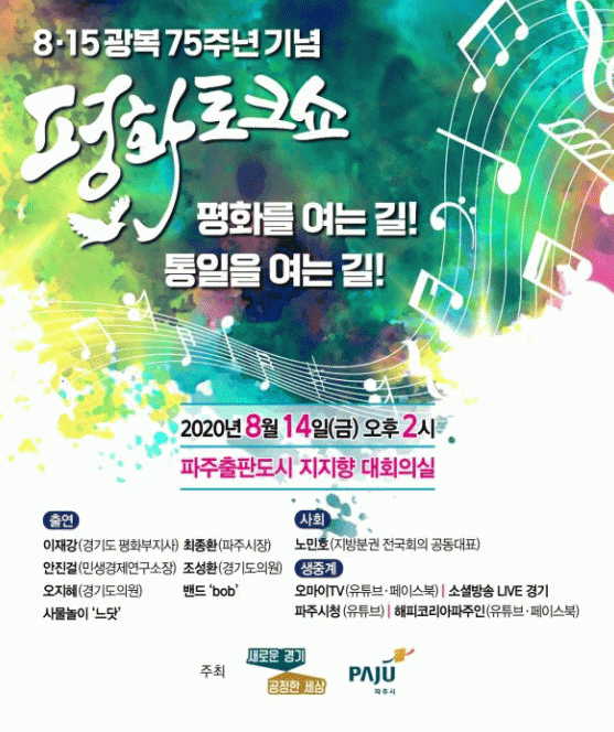 ¡®Æòȸ¦ ¿©´Â±æ! ÅëÀÏÀ» ¿©´Â±æ!¡¯À» ÁÖÁ¦·Î °æ±âµµ¿Í ÆÄÁֽð¡ °øµ¿À¸·Î ¸¶·ÃÇÑ À̹ø ÆòÈÅäÅ©¼î´Â ÀÌÀç° °æ±âµµ ÆòȺÎÁö»ç, ÃÖÁ¾È¯ ÆÄÁÖ½ÃÀå, Á¶¼ºÈ¯, ¿ÀÁöÇý µµÀÇ¿ø, ¾ÈÁø°É ¹Î»ý¿¬±¸¼Ò ¼ÒÀå µîÀÌ ÆÐ³Î·Î Âü¼®ÇÏ¸ç ³ë¹ÎÈ£ Áö¹æºÐ±Ç Àü±¹È¸ÀÇ °øµ¿´ëÇ¥°¡ »çȸ¸¦ ¸Ã´Â´Ù.