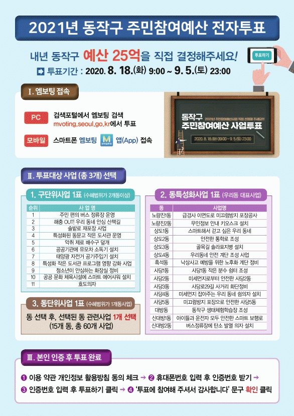 ÀüÀÚÅõÇ¥´Â ½º¸¶Æ®Æù ¿¥º¸ÆÃ ¾ÛÀ̳ª ȨÆäÀÌÁö(https://mvoting.seoul.go.kr)¿¡ Á¢¼ÓÇØ, ¡®2021³â µ¿ÀÛ±¸ ÁÖ¹ÎÂü¿©¿¹»ê ¼±Á¤ÅõÇ¥¡¯¿¡¼ ½ÇÇàÇÏ¸é µÈ´Ù.