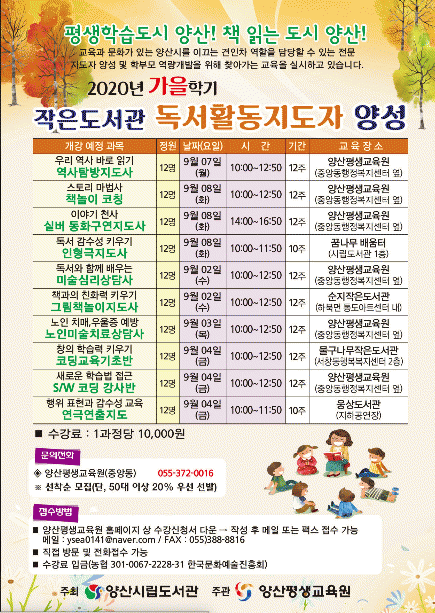 ¸ðÁýÀοøÀº °úÁ¤º° 12¸í¾¿ ÃÑ 120¸íÀ̸ç, ÁÖ 1ȸ 3½Ã°£¾¿ 10~12ÁÖ·Î ¿î¿µµÈ´Ù. Àå¼Ò´Â ¾ç»êÆò»ý±³À°¿ø ¹× °ü³» °ø°øµµ¼°üÀ¸·Î, ¼ö°·á´Â °úÁ¤ ´ç 10,000¿øÀÌ´Ù. ÀÚ¼¼ÇÑ »çÇ×Àº ¾ç»êÆò»ý±³À°¿ø ȨÆäÀÌÁö °øÁö»çÇ×À» ÅëÇØ È®ÀÎÇϰųª Æò»ý±³À°¿ø(¢Ï372-0016)À¸·Î ¹®ÀÇÇÏ¸é µÈ´Ù. ¡Ø