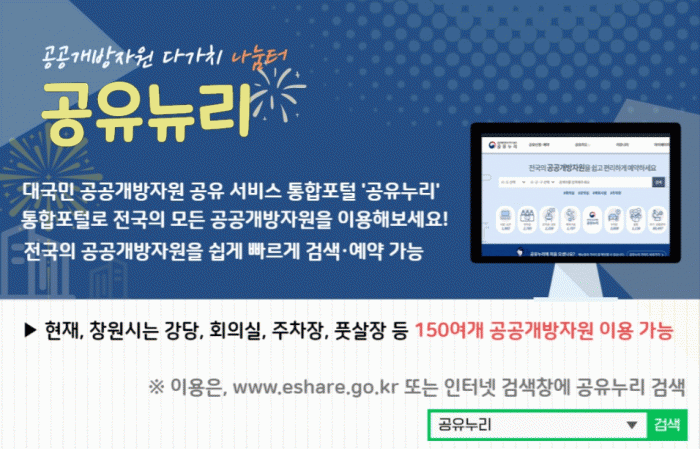 8¿ù ÇöÀç Àü±¹ÀûÀ¸·Î´Â üÀ°½Ã¼³ 1,708°³¼Ò, ÁÖÂ÷Àå 3,803°³¼Ò, ȸÀÇ½Ç 2,785°³¼Ò, ±³À°°Á 662°³ µîÀÌ µî·ÏµÇ¾î ÀÖÀ¸¸ç, â¿ø½Ã¿¡¼´Â ³»¼½ºÆ÷Ã÷¼¾ÅÍ Ç²»ìÀå, ÇàÁ¤º¹Áö¼¾ÅÍ È¸ÀǽÇ, °´ç, ÁÖÂ÷Àå µî °³¹æ°¡´É °ø°øÀÚ¿ø 150¿©°³¸¦ µî·ÏÇÏ¿© °øÀ¯ Áß¿¡ ÀÖ´Ù.