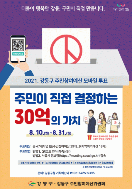 2021³âµµ ÁÖ¹ÎÂü¿©¿¹»êÀ¸·Î ÃÖÁ¾ ¼±Á¤µÉ »ç¾÷Àº À̹ø ¸ð¹ÙÀÏÅõÇ¥ °á°ú(50%)¿Í ´ÙÀ½´Þ 3ÀÏ °³ÃÖ ¿¹Á¤ÀÎ ¡®°µ¿±¸ ÁÖ¹ÎÂü¿©¿¹»ê ÃÑȸ¡¯¿¡¼ ÁÖ¹ÎÂü¿©¿¹»êÀ§¿ø ÇöÀå ÅõÇ¥°á°ú(50%)¸¦ ÇÕ»êÇØ ÃÖÁ¾ °áÁ¤µÈ´Ù. ±¸´Â 8¿ù 24ÀϺÎÅÍ 28ÀϱîÁö ±¸Ã» Á¦2û»ç 1Ãþ ·Îºñ¿¡¼ ÀüÀÚÅõÇ¥ Âü¿©¿¡ ´ëÇÑ È«º¸ºÎ½ºµµ ¿î¿µÇϸç, ÅõÇ¥ Á¾·á ÈÄ Âü¿©ÀÚ¿¡°Ô Ãß÷À» ÅëÇØ ¼ÒÁ¤ÀÇ »óǰµµ ÁõÁ¤ÇÒ °èȹÀÌ´Ù.