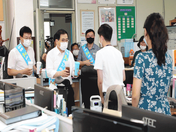 Ä¿ÇǸ¦ ¹Þ¾Æµç ÇÑ Á÷¿øÀº ¡°»ý°¢Áöµµ ¸øÇÑ ¼Õ´ÔÀÇ ¹æ¹®¿¡ ±ô¦ ³î¶ú´Ù¡±¸ç ¡°Äڷγª19·Î ÀÎÇÑ ÇØ¿ÜÀÔ±¹ÀÚ ¼ö¼Û, ¹ö½ºÆÄ¾÷ µîÀ¸·Î ÁöÄ¥´ë·Î ÁöÃÄÀÖ¾ú´Âµ¥, ½ÃÀå´ÔÀÌ Á÷Á¢ Ä¿ÇǸ¦ ¸¸µé¾î Èû³»¶ó´Â ¸»°ú ÇÔ²² °Ç³×ÁÖ¾î, ¸¶À½¼ÓÀÇ ¹«¾ð°¡°¡ ½º¸£¸£ Ç®¾îÁö´Â ±âºÐÀÌ´Ù¡±¸ç ¡°¼Õ¿¡ ¹ÞÀº °ÍÀº ½Ã¿øÇÑ Ä¿ÇÇÁö¸¸, ÀüÇØÁø °ÍÀº µû¶æÇÑ ¸¶À½¡±À̶ó°í °¨µ¿Çß´Ù.