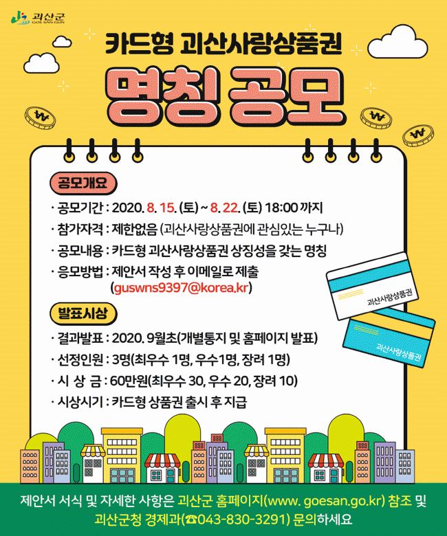 ¼±Á¤ °á°ú´Â 9¿ù ÃÊ ¹ßÇ¥ÇÒ ¿¹Á¤À̸ç, ¼±Á¤ ±âÁØ, À¯ÀÇ»çÇ× µî ÀÚ¼¼ÇÑ ³»¿ëÀº ±«»ê±º ȨÆäÀÌÁö¿¡¼ °ø°í¹®À» ÅëÇØ È®ÀÎÇϰųª, ±«»ê±º °æÁ¦°ú °æÁ¦Á¤Ã¥ÆÀ(043-830-3291)À¸·Î ¹®ÀÇÇÏ¸é µÈ´Ù.