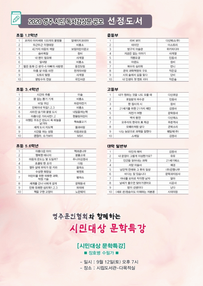 À̹ø ¡®2020³â ½Ã¹Î µ¶¼°¨»ó¹®¡¯ °ø¸ð¿¡ °üÇÑ ÀÚ¼¼ÇÑ ³»¿ëÀº ȨÆäÀÌÁö °øÁö»çÇ×À» Âü°íÇϰųª ¿µÁֽø³µµ¼°ü(¢Ï054-639-7733) ¶Ç´Â Çѱ¹¹®ÀÎÇùȸ ¿µÁÖÁöºÎ·Î ¹®ÀÇÇÏ¸é µÈ´Ù.