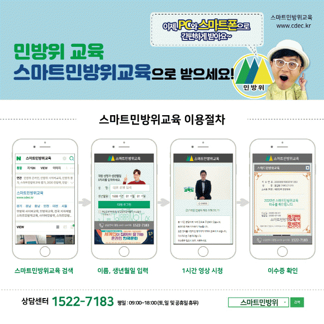 ±³À°´ë»óÀº ¼±¸¿¡ ÁÖ¼ÒÁö¸¦ µÐ ¸ðµç ¹Î¹æÀ§ ´ë¿øÀ̸ç PC¿Í ½º¸¶Æ®ÆùÀ» ÀÌ¿ë ¡°½º¸¶Æ®¹Î¹æÀ§±³À°¡± »çÀÌÆ®¿¡ Á¢¼ÓÇØ º»ÀÎÀÎÁõ ÈÄ ¾à 1½Ã°£ ±³À° ¿µ»ó ½Ãû ÈÄ °´°ü½Ä Æò°¡ 20¹®Ç× Áß 14¹®Ç× ÀÌ»ó ¸ÂÃß¸é ±³À°À» À̼öÇÑ °ÍÀ¸·Î ÀÎÁ¤µÈ´Ù.