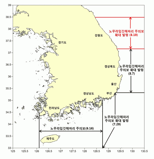 ±¹¸³¼ö»ê°úÇпøÀº Áö³ 6¿ù 16ÀÏ Àü³², °æ³², Á¦ÁÖ ÇØ¿ª¿¡ ³ë¹«¶óÀÔ±êÇØÆÄ¸® ÁÖÀÇ´Ü°è Æ¯º¸¸¦ ¹ß·ÉÇÏ¿´À¸¸ç, 7¿ù 29ÀÏ ºÎ»ê, 8¿ù 7ÀÏ ¿ï»ê, °æºÏ ÇØ¿ª±îÁö È®´ë ¹ß·ÉÇÑ ¹Ù ÀÖ´Ù. ÀÌÈÄ 8¿ù ÃʺÎÅÍ ¿ï»ê, °æºÏÇØ¿ª¿¡ °í¹Ðµµ·Î ÃâÇöÇÑ ³ë¹«¶óÀÔ±êÇØÆÄ¸®°¡ ÇØ·ù¸¦ µû¶ó µ¿ÇؾÈÀ¸·Î ±Þ¼ÓÈ÷ È®»êµÇ¾î °¿øÇØ¿ª±îÁö ÁÖÀÇ´Ü°è Æ¯º¸¸¦ È®´ë ¹ß·ÉÇÏ°Ô µÇ¾ú´Ù.