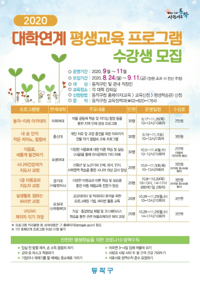 Âü¿©¸¦ Èñ¸ÁÇÏ´Â ÁֹΠ¶Ç´Â Áö¿ª ³» Á÷ÀåÀÎÀº ³»´Þ 11ÀϱîÁö ±¸Ã» ȨÆäÀÌÁö¸¦ ÅëÇØ ½Åû°¡´ÉÇÏ´Ù. ¸ðÁýÀοø Ãʰú ½Ã Àü»ê Ãß÷À¸·Î ¼ö°»ýÀ» ¼±Á¤Çϸç, °ÀÇ´Â 9¿ùºÎÅÍ 11¿ù±îÁö °¢ ´ëÇб³ °Àǽǿ¡¼ ÁøÇàÇÑ´Ù. ´Ü, Äڷγª19 Áö¿ª»çȸ È®»êÀ¸·Î °ÀÇ ÀÏÁ¤ÀÌ ¿¬±âµÇ°Å³ª ¿Â¶óÀÎ ±³À°À¸·Î º¯°æµÉ ¼ö ÀÖ´Ù.