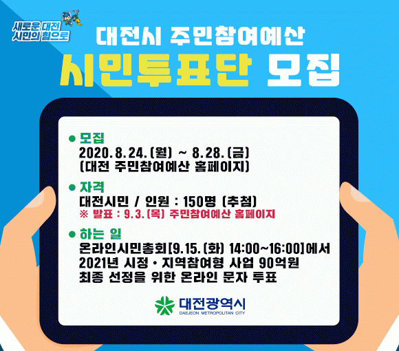 ½Ã¹ÎÅõÇ¥´ÜÀº ´ÙÀ½´Þ 15ÀÏ ¿¸®´Â ½Ã¹Î¿Â¶óÀÎ ÃÑȸ¿¡¼ 2021³â ¿¹»ê¿¡ ¹Ý¿µÇÒ ´ëÀü½Ã ÁÖ¹ÎÂü¿©¿¹»ê 150¾ï ¿ø Áß ½ÃÁ¤Âü¿©Çü »ç¾÷ 70¾ï ¿ø°ú Áö¿ªÂü¿©Çü »ç¾÷ 20¾ï ¿ø ¼±Á¤À» À§ÇÑ ¿Â¶óÀÎ ¹®ÀÚ ÅõÇ¥¿¡ Âü¿©ÇÏ°Ô µÈ´Ù.