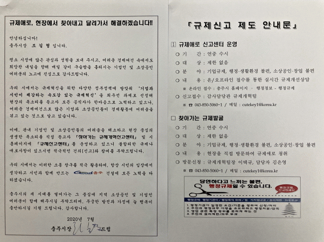 ¼Çѹ®¿¡´Â ¡¸Ã£¾Æ°¡´Â ±ÔÁ¦°³Çõ½Å°í¼¾ÅÍ¡¹, ¹× ½Ã ȨÆäÀÌÁö¿¡ ¡¸±ÔÁ¦½Å°í¼¾ÅÍ¡¹ µî ´Ù¾çÇÑ Ã¤³ÎÀ» ¿î¿µÇϰí ÀÖÀ¸¸ç, ±×µ¿¾È ºÒÆíÇß´ø °¢Á¾ ±ÔÁ¦³ª ¾Ö·Î»çÇ׿¡ ´ëÇØ °ÇÀÇ¿Í Âü¿©¸¦ ´çºÎÇÏ´Â ³»¿ëÀ» ´ã°í ÀÖ´Ù.