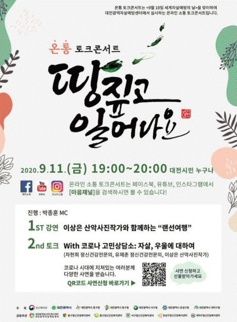 ´ëÀü½Ã´Â Äڷγª19¿Í °ü·ÃÇÑ ÀÚ»ì, ¿ì¿ï¿¡ ´ëÇÑ °í¹ÎÀ̳ª ±Ã±ÝÇÑ Á¡À» ÁÖÁ¦·Î »ç¿¬ ½ÅûÀ» ¹Þ°í ÀÖÀ¸¸ç, »ç¿¬ ½ÅûÀº ¹Ù·Î°¡±â(https://url.kr/fndO5r) ȤÀº Å¥¾Ë(QR)ÄÚµå·Î ÇÒ ¼ö ÀÖ´Ù.