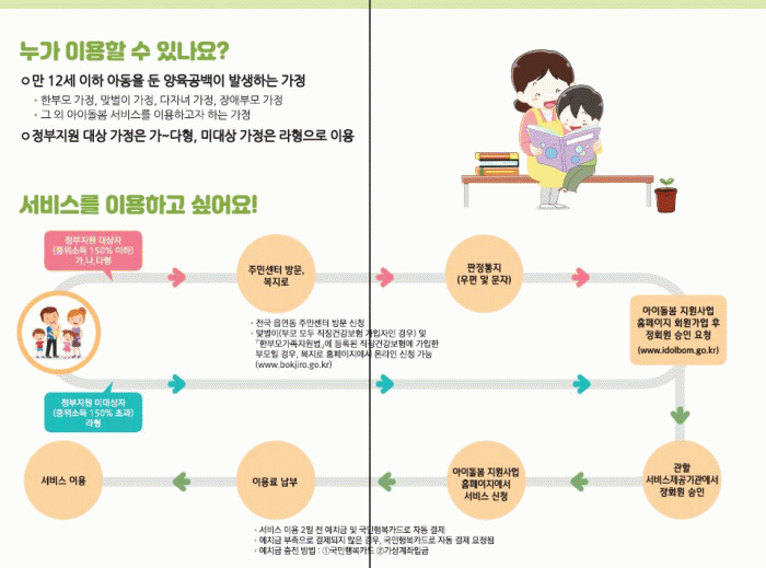¿µ¾ÆÁ¾ÀÏÁ¦ ¼ºñ½º´Â »ýÈÄ 3°³¿ùºÎÅÍ ¸¸ 36°³¿ù ÀÌÇÏ ¿µ¾Æ°¡ ÀÖ´Â °¡Á¤ÀÌ ´ë»óÀ̸ç, ¡ãÀÌÀ¯½Ä ¸ÔÀ̱⠡ãÁ¥º´ ¼Òµ¶ ¡ã±âÀú±Í °¥ÀÌ ¡ã¸ñ¿å µîÀÇ ¼ºñ½º¸¦ 1ȸ 3½Ã°£ ÀÌ»ó ½ÅûÇÒ ¼ö ÀÖ´Ù.