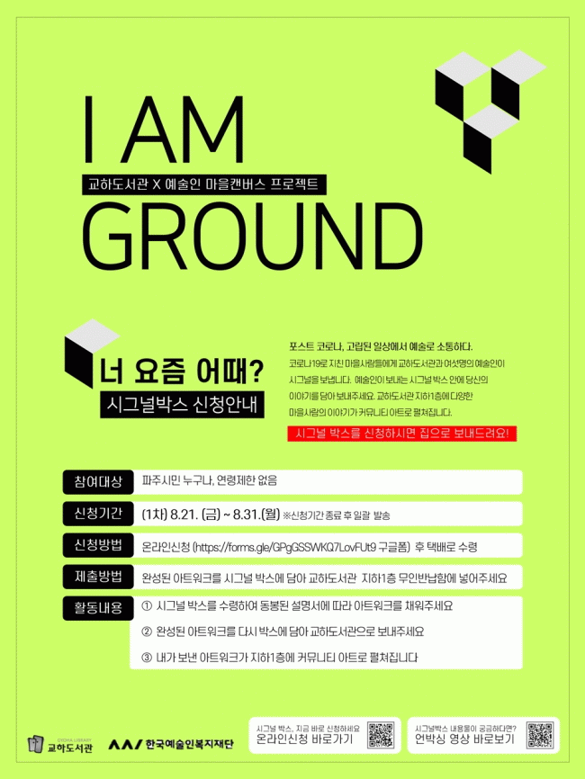 ±³Çϵµ¼°üÀº ¿Â¶óÀÎÀ¸·Î ÇÁ·ÎÁ§Æ® Âü¿©ÀÚ¸¦ ¸ðÁýÇÏ¸ç ½ÅûÀÚÀÇ ÁýÀ¸·Î ¿¹¼úÀεéÀÌ ±âȹÇÑ ¾ÆÆ®¿öÅ©°¡ ´ã±ä ¡®½Ã±×³Î¹Ú½º¡¯¸¦ ¹è¼ÛÇÑ´Ù. ½Ã±×³Î¹Ú½º¿¡´Â ¾ÆÆ®¿öÅ©ÀÇ Àç·á¿Í ¼³¸í¼°¡ ´ã°ÜÀÖÀ¸¸ç ¸¶À»»ç¶÷µéÀº ½Ã±×³Î¹Ú½º¸¦ ÅëÇØ Äڷγª »óȲ¿¡ ´ëÇÑ °¢ÀÚÀÇ »ý°¢°ú ÀÏ»óÀ» ¿¹¼úÀû ¹æ½ÄÀ¸·Î Ç®¾î³¾ ¼ö ÀÖ´Ù. ¿À´Â 10¿ù¿¡´Â ¿¹¼úÀÎÆÀÀÌ ¸¶À»»ç¶÷ÀÇ À̾߱Ⱑ ´ã±ä ½Ã±×³Î¹Ú½º¸¦ ¸ð¾Æ ±³Çϵµ¼°ü ÁöÇÏ 1Ãþ¿¡ Ä¿¹Â´ÏƼ ¾ÆÆ®¸¦ ¼³Ä¡ÇÒ ¿¹Á¤ÀÌ´Ù.