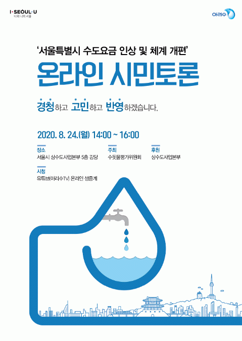 ÀÌ¿Í °ü·ÃÇØ ¼¿ï½Ã »ó¼öµµ»ç¾÷º»ºÎ¿Í ¼öµ¾¹°Æò°¡À§¿øÈ¸´Â ¡¸¼¿ïƯº°½Ã ¼öµµ¿ä±Ý Àλó ¹× ¿ä±Ýü°è °³Æí¡¹¿¡ °üÇÑ ½Ã¹Î Åä·Ðȸ¸¦ 8¿ù 24ÀÏ ¿ÀÈÄ 2½Ã ¿Â¶óÀÎÀ¸·Î °³ÃÖÇÏ°í ´Ù¾çÇÑ ½Ã¹Î ÀǰßÀ» ¼ö·ÅÇÑ´Ù.