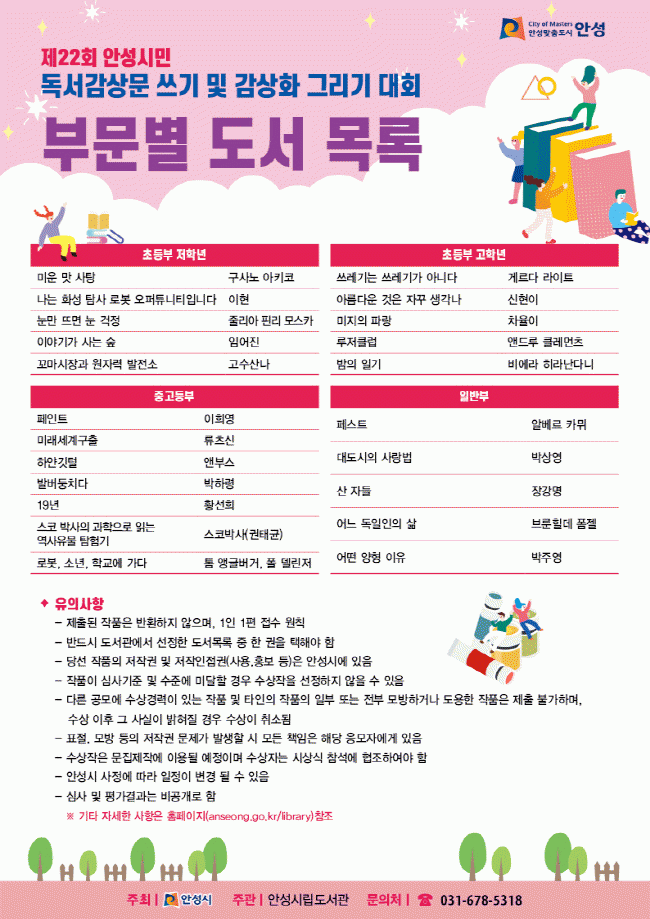 Âü°¡ÀÚµéÀº ÃʵîºÎ¿Í Áß¡¤°íµîºÎ ±×¸®°í ÀϹݺηΠ³ª´« ´ë»ó µµ¼¸¦ ÀÐ°í µ¶ÈݨÀ» Á¦ÃâÇÏ¸é µÈ´Ù. ´ë»ó µµ¼´Â ¾È¼º½Ã »ç¼°¡ Á÷Á¢ ¼±Á¤ÇÑ ¡®Æä½ºÆ®¡¯¸¦ ºñ·ÔÇÑ ¡®¹Ì¿î¸À »çÅÁ¡¯, ¡®¹Ì·¡¼¼°è±¸Ã⡯ µî 22±ÇÀÌ´Ù.