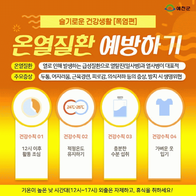 ¿¹Ãµ±º °ü°èÀÚ´Â ¡°¿Â¿Áúȯ °¨½Ãü°è¸¦ Áö³ 5¿ù 20ÀϺÎÅÍ 9¿ù 30ÀϱîÁö ¿î¿µÇϰí ÀÖÀ¸¸ç °Ç°ÇÑ ¿©¸§À» ³¯ ¼ö ÀÖµµ·Ï ¹° ÀÚÁÖ ¸¶½Ã±â, ´õ¿î ½Ã°£´ë ÈÞ½ÄÇÏ±â µî °Ç° ¼öÄ¢À» ÁؼöÇÏ±æ ¹Ù¶õ´Ù.¡±¸ç ¡°¶ÇÇÑ, º¸°ÇÁö¼Ò¿Í Áø·á¼Ò µî º¸°Ç±â°üÀ» ¹«´õÀ§ ½°ÅÍ·Î ¿î¿µÇϰí ÀÖÀ¸´Ï Àû±Ø ÀÌ¿ëÇÏ½Ã±æ ¹Ù¶õ´Ù.¡±°í ¸»Çß´Ù.