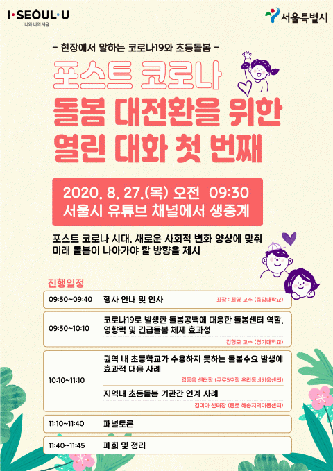 ¼¿ï½Ã´Â Äڷγª19 ÀÌÈÄ ¨ç ¡®ÃÊµî µ¹º½¼¾ÅÍÀÇ ¿ªÇÒ°ú °úÁ¦¡¯, ¨è ¡®µ¹º½¼ºñ½º Áö¿ø ¹æÇ⡯, ¨é ¡®µ¹º½ ´ëÀüȯ°ú ºñÀü¡¯À̶ó´Â Ű¿öµå·Î µ¹º½Á¾»çÀÚ, ½Ã¹Î, Á¤Ã¥¼ö¿äÀÚ, Àü¹®°¡ µî°ú ¿Â¶óÀÎÀ» ÅëÇÑ ¿¸° ´ëȸ¦ ¿¬¼ÓÀûÀ¸·Î ÃßÁøÇÏ¿© ´Ù¾çÇÑ ÇöÀåÀÇ ÀǰßÀ» µè°í, ¹Ì·¡µ¹º½ÀÇ ºñÀü ¹× Àü·«, ¼¼ºÎ°úÁ¦ µîÀ» Á¤¸³ÇØ ³ª°¡°íÀÚ ÇÑ´Ù.