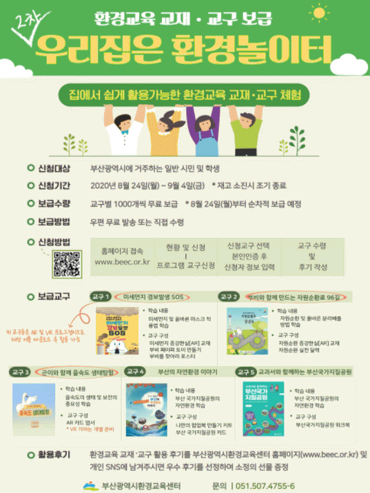 ±³Àç¿Í ±³±¸ ¹«·á½ÅûÀº ³»´Þ 4ÀϱîÁö ºÎ»ê½Ãȯ°æ±³À°¼¾ÅÍ È¨ÆäÀÌÁö(https://beec.or.kr/)¿¡¼ ÇÒ ¼ö ÀÖ´Ù. ½Åû ¼ö·®Àº ÇÑ °¡Á¤´ç ±³À硤±³±¸º° 1¼¼Æ®¾¿ÀÌ¸ç ½Åû Áï½Ã ´çÀÏ ¹«·á¹è¼ÛÀÌ ÁøÇàµÈ´Ù. ºÎ»ê½Ã´Â ÃÑ 5,000¼¼Æ®¸¦ º¸±ÞÇÒ ¿¹Á¤ÀÌ´Ù.