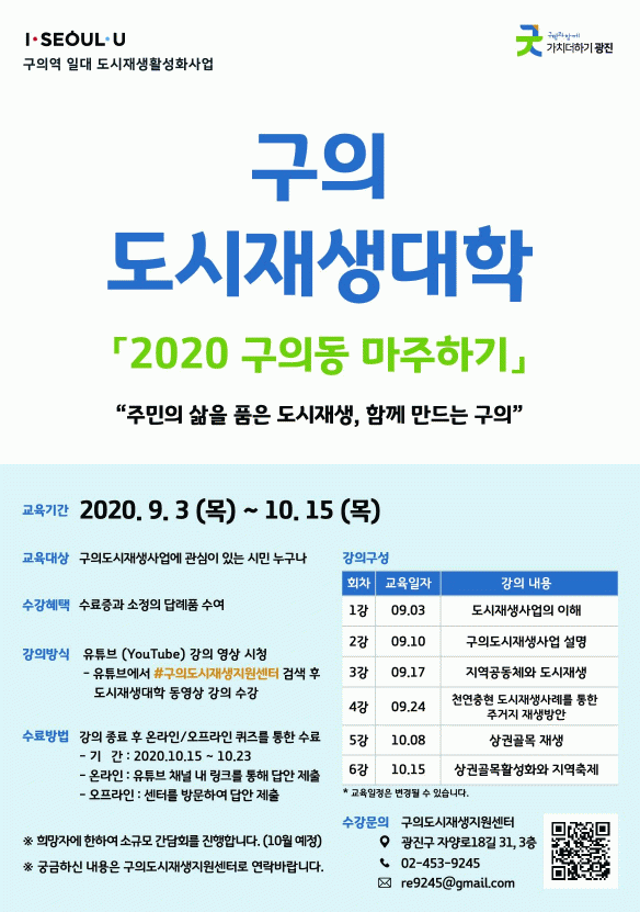 °ÀÇ´Â ±¸Àǵµ½ÃÀç»ýÁö¿ø¼¾ÅÍ À¯Æ©ºê¸¦ ÅëÇØ 10¿ù 15ÀϱîÁö ¸ÅÁÖ ¸ñ¿äÀÏ ¡ãµµ½ÃÀç»ý»ç¾÷ÀÇ ÀÌÇØ ¡ãÁö¿ª°øµ¿Ã¼¿Í µµ½ÃÀç»ý µî »õ·Î¿î ÁÖÁ¦·Î ¾÷·ÎµåµÇ¸ç, °ü½ÉÀÖ´Â ÁÖ¹ÎÀº ´©±¸³ª ¼ö°ÇÒ ¼ö ÀÖ´Ù. °ÀÇ ¼ö° Á¾·á ÈÄ Á¦½ÃµÈ ÄûÁîÀÇ ´äÀ» ¿Â¶óÀÎ ¶Ç´Â ¿ÀÇÁ¶óÀÎÀ¸·Î Á¦ÃâÇÏ¸é ¼ö·á°¡ ¿Ï·áµÈ´Ù.