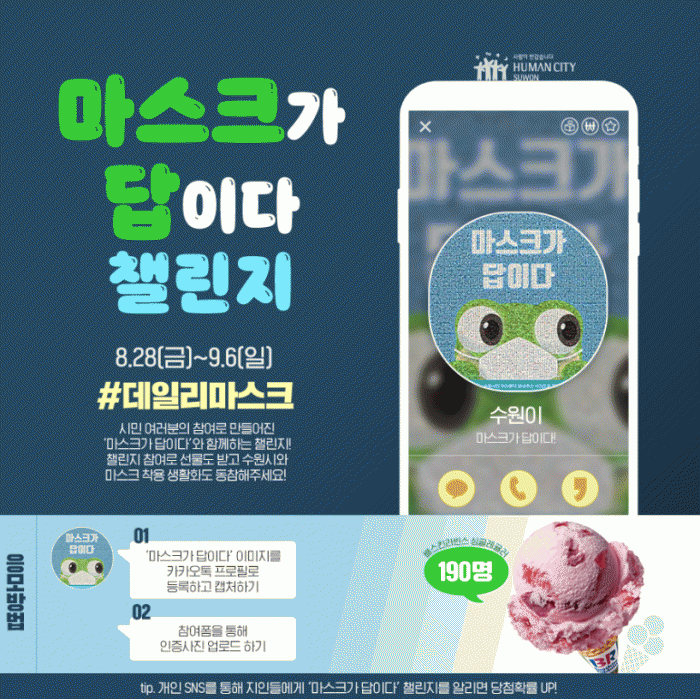 ¼ö¿ø½Ã ´ëÇ¥ SNS¿¡¼ ¡®¡®¸¶½ºÅ©°¡ ´äÀÌ´Ù¡¯ 縰Áö¿¡ µ¿ÂüÇØ ÁÖ¼¼¿ä¡¯ °Ô½Ã¹°À» ã¾Æ ÷ºÎµÈ À̹ÌÁö¸¦ ÀÚ½ÅÀÇ Ä«Ä«¿ÀÅå ÇÁ·ÎÇÊ »çÁøÀ¸·Î ¿Ã¸®°í, ³×À̹ö Æû(http://naver.me/xT76iyds)À¸·Î ÀÎÁõ»çÁøÀ» º¸³»¸é µÈ´Ù. Ãß÷À» ÅëÇØ Âü¿© ½Ã¹Î 190¸í¿¡°Ô ¡®¾ÆÀ̽ºÅ©¸² ÄíÆù¡¯À» Áö±ÞÇÑ´Ù.