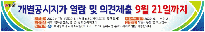 À̹ø °³º°°ø½ÃÁö°¡´Â 2020³â 1¿ù 1ÀϺÎÅÍ 6¿ù 30ÀϱîÁö ºÐÇÒ, ÇÕº´, Áö¸ñº¯°æ µî ÅäÁöÀ̵¿ÀÌ ¹ß»ýÇÑ °³º° ÅäÁö¿¡ ´ëÇÏ¿© 2020³â 7¿ù 1ÀÏ ±âÁØÀ¸·Î °³º°°ø½ÃÁö°¡¸¦ »êÁ¤ÇÏ°í °¨Á¤Æò°¡»çÀÇ °ËÁõÀ» ¿Ï·áÇÑ Á¦°ö¹ÌÅÍ(§³)´ç °¡°ÝÀ¸·Î¼, ½Ãû ÅäÁöÁ¤º¸°ú, ÀåÀ¯ÃâÀå¼Ò ¹× À¾¡¤¸é¡¤µ¿ ÇàÁ¤º¹Áö¼¾ÅÍ¿¡¼ ¿¶÷ÇÒ ¼ö ÀÖÀ¸¸ç, ±èÇØ½Ã ȨÆäÀÌÁö ¹× °æ³² ºÎµ¿»êÁ¤º¸Á¶È¸½Ã½ºÅÛ¿¡¼µµ È®ÀÎÇÒ ¼ö ÀÖ´Ù.