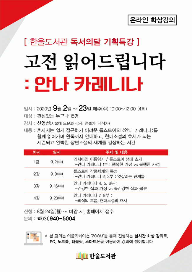 À̹ø°ÀÇ´Â ¾îÇø®ÄÉÀÌ¼Ç ¡®ZOOM¡¯À» ÅëÇØ ½Ç½Ã°£ ¿Â¶óÀÎ È»ó°ÀÇ·Î ¿î¿µµÈ´Ù. Äڷγª19·Î ÀÎÇØ µµ¼°ü ÀÌ¿ëÀÌ ºÒ°¡ÇÑ ÆÄÁÖ ½Ã¹Îµé¿¡°Ô, È¥ÀÚ¼´Â ½±°Ô Á¢±ÙÇϱ⠾î·Á¿î Å罺ÅäÀÌÀÇ <¾È³ª Ä«·¹´Ï³ª>¸¦ ÇÔ²² ÀÐÀ¸¸ç ¿Ïµ¶±îÁö ¾È³»Çϰí Çö´ë¼Ò¼³ÀÇ È¿½Ã°¡ µÇ´Â ¼¼·ÃµÇ°í ¿Ïº®ÇÑ ÀåÆí¼Ò¼³ÀÇ ¼¼°è¸¦ °¨»óÇÏ´Â ½Ã°£À» °®±â À§ÇØ ±âȹµÆ´Ù.