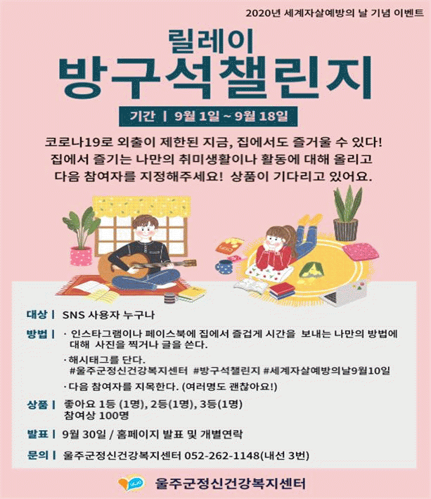 Á¤½Å°Ç°¿¡ °ü½É ÀÖ´Â ÁֹΠ´©±¸³ª Âü¿©ÇÒ ¼ö ÀÖÀ¸¸ç, »çȸÀû °Å¸®µÎ±â·Î ÀÎÇØ Áý¿¡¼ ¸Ó¹«¸£¸é¼ »ý±â´Â ´ä´äÇÔÀ̳ª ºÒ¾È°¨À» ÇØ¼ÒÇϱâ À§ÇØ °£´ÜÈ÷ Áñ±æ ¼ö Àִ Ȱµ¿À̳ª Ãë¹Ì»ýȰ¿¡ ´ëÇÑ ±Û°ú »çÁøÀ» °³ÀÎ SNS¸¦ Ȱ¿ëÇÏ¿© °Ô½ÃÇÏ¸é µÈ´Ù.