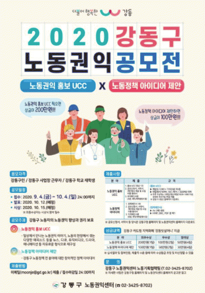 ¡®°µ¿±¸ ³ëµ¿ÀÚÀÇ ³ëµ¿±ÇÀÍ Çâ»ó°ú ±Ç¸®º¸È£¡¯¸¦ ÁÖÁ¦·Î 9¿ù 4ÀϺÎÅÍ 10¿ù 4ÀϱîÁö 4ÁÖ°£ Á¢¼ö¹Þ´Â´Ù. °ø¸ðºÐ¾ß´Â ³ëµ¿Á¸Áß ¹®È È®»ê »ç¾÷¿¡ Àû±Ø Ȱ¿ëÇϱâ À§ÇÑ ¡®³ëµ¿±ÇÀÍ È«º¸ UCC¡¯¿Í ´Ù¾çÇÏ°í ½Ç¿ëÀûÀÎ ³ëµ¿Á¤Ã¥À» ¹ß±¼ÇÏ¿© °µ¿±¸ ³ëµ¿Á¤Ã¥¿¡ ¹Ý¿µÇϱâ À§ÇÑ ¡®³ëµ¿Á¤Ã¥ ¾ÆÀ̵ð¾î Á¦¾È¡¯ ÃÑ 2°³ ºÐ¾ß·Î ±¸¼ºµÇ¾ú´Ù.