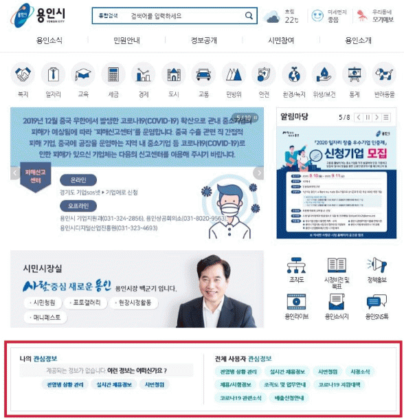 ¹æ¹®ÀÚ º°·Î ÀÚÁÖ ÀÌ¿ëÇÏ´Â ¸Þ´º¸¦ 1½Ã°£ ´ÜÀ§·Î °»½ÅÇØ º¸¿©ÁÖ´Â ¡®³ªÀÇ °ü½ÉÁ¤º¸¡¯¿Í Àüü ¹æ¹®ÀÚ°¡ ÀÚÁÖ ÀÌ¿ëÇÏ´Â ¸Þ´º¸¦ ºÐ¼®ÇØ º¸¿©ÁÖ´Â ¡®Àüü »ç¿ëÀÚ °ü½ÉÁ¤º¸¡¯·Î ±¸¼ºµÆ´Ù. ÀÌ ¼­ºñ½º´Â ½Ã ȨÆäÀÌÁö ½Ã¹Î½ÃÀå½Ç ÄÜÅÙÃ÷ ¹Ù·Î ¾Æ·¡¿¡ ÀÖ´Ù.