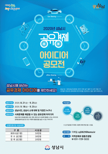 ±â°£ ³» ¼º³²½Ã ȨÆäÀÌÁö(½ÃÁ¤¼Ò½Ä¡æÇà»ç/°ÁÂ/°ø¸ð)¿¡ ÀÖ´Â °øÀ¯°æÁ¦ ¾ÆÀ̵ð¾î Á¦¾È »ó¼¼ ¼³¸í¼, ½Åû¼ µîÀ» ÀÛ¼ºÇØ °øÀ¯ ¼º³² ´ã´çÀÚ À̸ÞÀÏ(cyj0829@korea.kr)·Î º¸³»¸é µÈ´Ù.