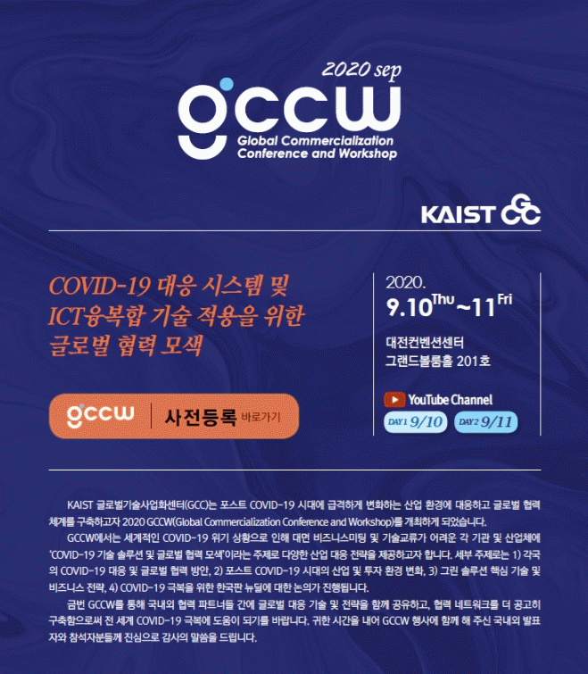 ´ëÀüÄÁº¥¼Ç¼¾ÅÍ ±×·£µåº¼·ë¿¡¼ ÁøÇàµÇ´Â ¿ÀÇÁ¶óÀÎ Âü¼®Àº »çÀü µî·ÏÀÚ¿¡ ÇÑÇØ °¡´ÉÇϸç, Çà»ç °ü·Ã ¹®Àdzª Âü°¡ ½ÅûÀº Ä«À̽ºÆ® ±Û·Î¹ú±â¼ú»ç¾÷ȼ¾ÅÍ È¨ÆäÀÌÁö(gcc.kaist.ac.kr)¿¡¼ ÇÏ¸é µÈ´Ù.