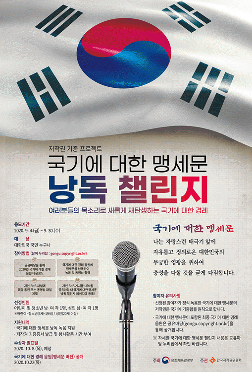 Âü¿© ¹æ¹ýÀº ´ÙÀ½°ú °°´Ù. ¸ÕÀú, À̹ø¿¡ °ø°³µÇ´Â ±¹±â¿¡ ´ëÇÑ °æ·Ê À½¿øÀ» ¹è°æÀ¸·Î ¡®±¹±â¿¡ ´ëÇÑ ¸Í¼¼¹®¡¯À» ³ìÀ½Çϰųª ³¶µ¶ÇÏ´Â ¸ð½ÀÀ» µ¿¿µ»óÀ¸·Î ÃÔ¿µÇÑ´Ù. ±×¸®°í ¿Ï¼ºµÈ À½¿ø ¶Ç´Â µ¿¿µ»óÀ» °³ÀÎ ´©¸®¼ÒÅë¸Á¿¡ ¿Ã¸° ÈÄ¿¡, ÇØ´ç °Ô½Ã¹°ÀÇ ÀÎÅÍ³Ý ¿µ¹® ÁÖ¼Ò(URL)¸¦ À§¿øÈ¸ °øÀ¯¸¶´ç ´©¸®Áý¿¡ µî·ÏÇϸé Âü¿©°¡ ¿Ï·áµÈ´Ù.