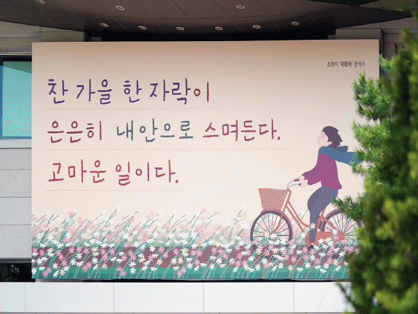 À̹ø °¡À»Æí Èñ¸Á±ÛÆÇÀÇ ¹®¾ÈÀº ¡°Âù °¡À» ÇÑÀÚ¶ôÀÌ ÀºÀºÈ÷ ³» ¾ÈÀ¸·Î ½º¸çµç´Ù. °í¸¶¿î ÀÏÀÌ´Ù¡±·Î Á¶Çâ¹Ì ½ÃÀÎÀÇ ¡¸±¹ÈÂ÷¡¹ Áß¿¡¼ ¹ßÃéÇÑ ¹®±¸¸¦ ½Ç¾ú´Ù. ¹è°æ¿¡´Â ÀÚÀü°Å¸¦ ź »ç¶÷ÀÌ ÄÚ½º¸ð½º°¡ Ȱ¦ ÇÉ ±æÀ» Áö³ª¸ç °¡À»¹Ù¶÷À» ´À³¢´Â ¸ð½ÀÀ» Ç¥ÇöÇØ ¹«¸£ÀÍÀº °¡À»ÀÇ Á¤Ã븦 ´ã¾Æ³Â´Ù.