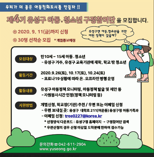 ¸ðÁý´ë»óÀº ¸¸ 10¼¼ ÀÌ»ó 15¼¼ ÀÌÇÏÀÇ À¯¼º±¸¿¡ °ÅÁÖÇϴ û¼Ò³â, À¯¼º±¸ ¼ÒÀç ÃÊ¡¤ÁßÇб³ ÀçÇлý, Çб³ ¹Û û¼Ò³â 30¸íÀÌ´Ù. Âü¿©¸¦ Èñ¸ÁÇϴ û¼Ò³âÀº ¹æ¹®, ¿ìÆí, À̸ÞÀÏ(tree0227@korea.kr