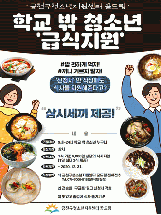 ±Ýõû¼Ò³âÁö¿ø¼¾ÅÍ ²Þµå¸²À» ÀÌ¿ëÇÏ´Â ¸ðµç Çб³ ¹Û û¼Ò³â(9¼¼~24¼¼)´ë»óÀ¸·Î, ¼Òµæ¼öÁذú °ü°è¾øÀÌ 1½Ä ±âÁØ 6,000¿ø »ó´ç, 1ÀÏ ÃÖ´ë 3½Ä±îÁö Áö¿øÇÑ´Ù.