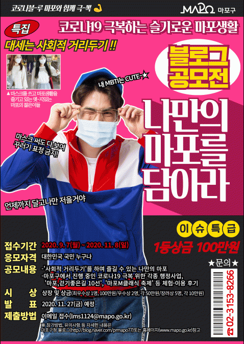 ½Åû ¹æ¹ýÀº °³ÀÎ ºí·Î±×¿¡ º»ÀÎÀÌ Á÷Á¢ üÇèÇϰí ÀÛ¼ºÇÑ ¸¶Æ÷±¸ °ü·Ã °ø°¨½ºÅ丮¸¦ °Ô½Ã(2020.1.1. ÀÌÈÄ Æ÷½ºÆÃÇÑ ÀÛǰ¿¡ ÇÑÇÔ)ÇÏ°í ¸¶Æ÷±¸ ºí·Î±× ¶Ç´Â ´©¸®Áý¿¡¼ ½Åû¼¸¦ ³»·Á ¹Þ¾Æ ÀÛ¼ºÇÏ¿© ¿À´Â 11¿ù 8ÀϱîÁö ¸¶Æ÷±¸ È«º¸°ú À̸ÞÀÏ(lms1124@mapo.go.kr)·Î Á¦ÃâÇÏ¸é µÈ´Ù.